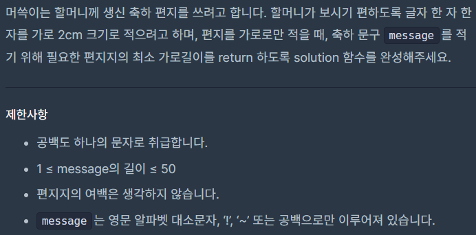 만약 "I love you~"라는 문구를 적고 싶으면 가로 길이의 최소가 22cm, "happy birthday!"는 30cm가 필요하다는 것을 알 수 있습니다. 여기서 편지지의 가로 최소 길이는 문자의 개수 * 2 라는 것을 알 수 있습니다.