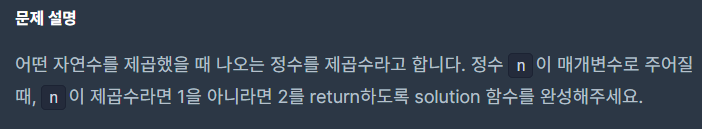 그리고 제곱은 자연수*자연수 꼴로 나타낼 수 있기 때문에 반복문을 사용해서 제곱과 n값을 비교하는 코드를 작성했습니다!