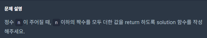 2번 방법 - i가 0이고, i가 n까지일 때 i+=2는 짝수기 때문에 이를 answer에 더해주면 됩니다.!!