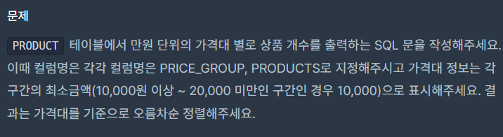 SELECT TRUNCATE(PRICE, -4) AS 'PRICE_GROUP', COUNT(PRODUCT_ID) AS 'PRODUCTS'