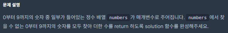 제가 문제를 보고 생각한 방법은 0부터 9까지의 숫자가 든 문자열을 선언한 후 numbers의 각 숫자가 문자열에 포함되어 있는지 여부를 확인한 후 포함되어 있다면 answer에 더한 후 45에서 answer을 빼는 방법을 생각했습니다.