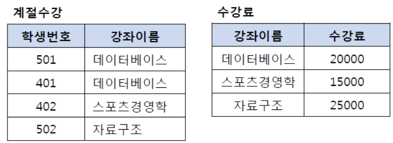 오른쪽 테이블과 왼쪽 테이블 중 중복된 오른쪽 테이블만 보여줌