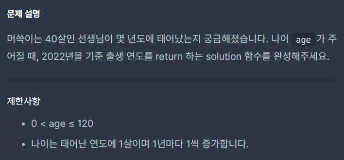 solution 함수는 리턴 값이 int이고, age를 매개변수로 가지네요~!