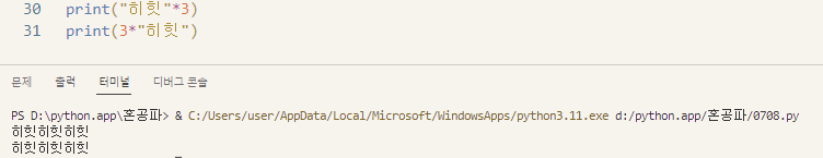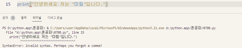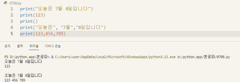 여러 개를 출력할 때는 ,(쉼표)로 연결할 수도 있습니다.