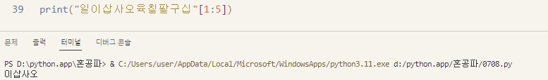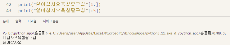 [숫자1:숫자2]로 출력할 문자열의 범위를 지정합니다. '숫자1 이상 ~ 숫자2 미만'으로 생각하면 쉽습니다.