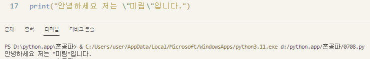 + 만약에 (안녕하세요 저는 "미림"입니다.)라는 문장을 출력하고 싶을 때